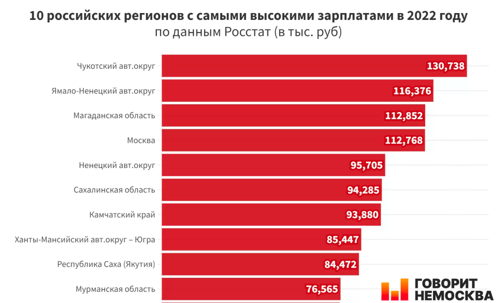 В остальных регионах выплаты варьируются от категорий воюющих: контрактников особенно мотивируют в ХМАО – 500000 рублей (4507 euro) при средней зарплате в регионе в 85447 рублей (768 eur), мобилизованным больше всего причитается в Чукотском и Ямало-Ненецком автономных округах и в Сахалинской области. Там заплатят по 300000 рублей (2700 euro). Добровольцам заплатят по 300 000 (2700 euro) в ЯНАО, Чукотском и Ненецком автономных округах. Учитывая, что согласно данным Росстата, среднемесячная заработная плата в этих регионах в 3 или 4 раза ниже, мотивация понятна.