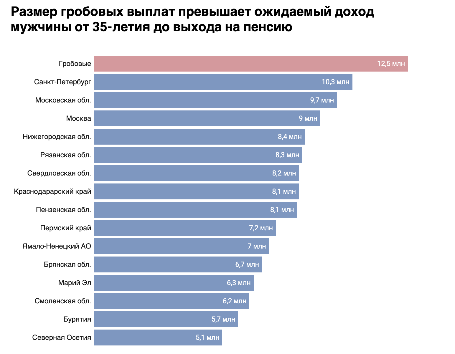 И на десерт: умереть в нынешней России выгоднее, чем жить — если речь идёт о гибели на фронте. Размер компенсаций семье мобилизованного или контрактника достигает 12,5 млн рублей — подавляющему большинству россиян столько не заработать за всю жизнь. Если сложить весь ожидаемый доход 35-летнего мужчины за всю оставшуюся трудовую жизнь, то выйдет меньше, чем обещанные выплаты. В восьми регионах выплаты за смерть на войне перекрывают весь потенциальный будущий доход даже для 18-летних.